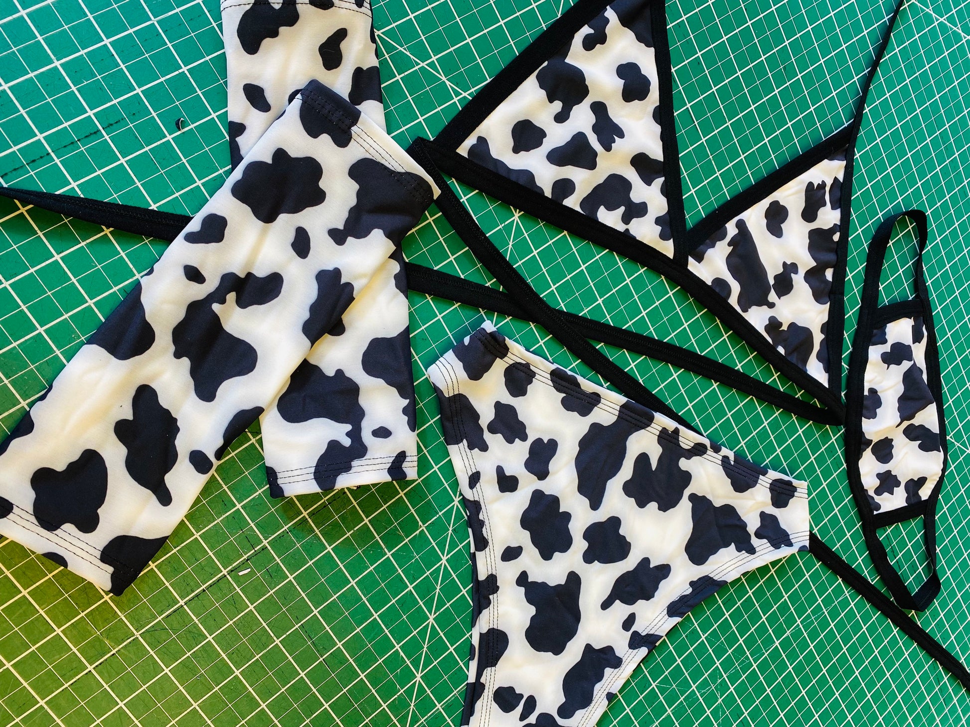 Handsewn set made in a beautiful spandex fabric. Fabric is 4 way stretch fabric. Set includes triangle top is your selected size, and matching high waisted high cut bottoms in your selected size!