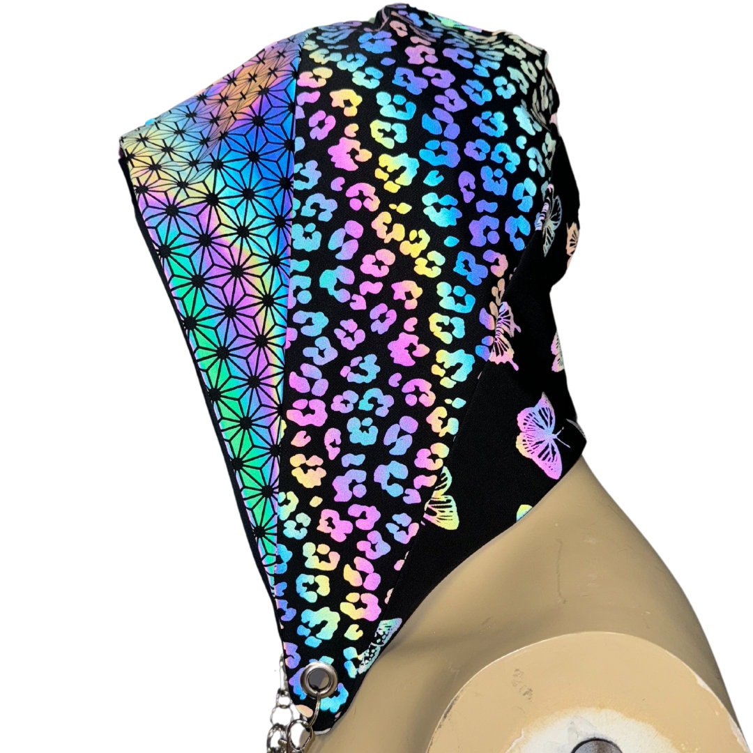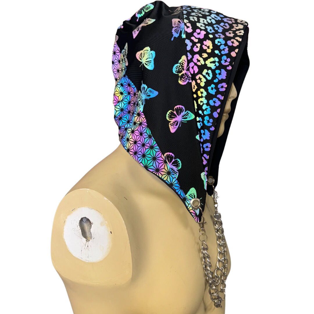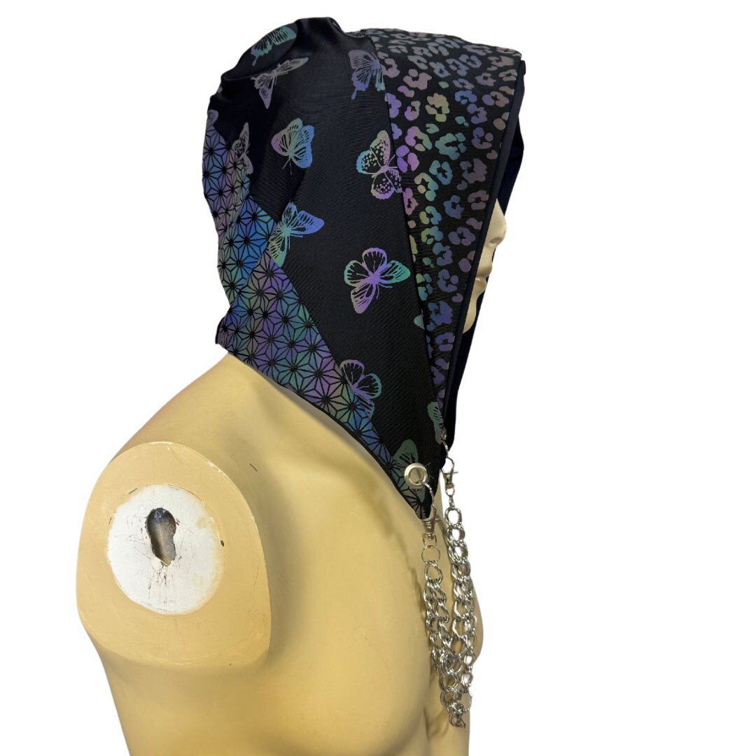 Handmade and handsewn reversible Assassin Hood with chain. Outer Fabric is a custom reflective print, inside fabric is a plain black.