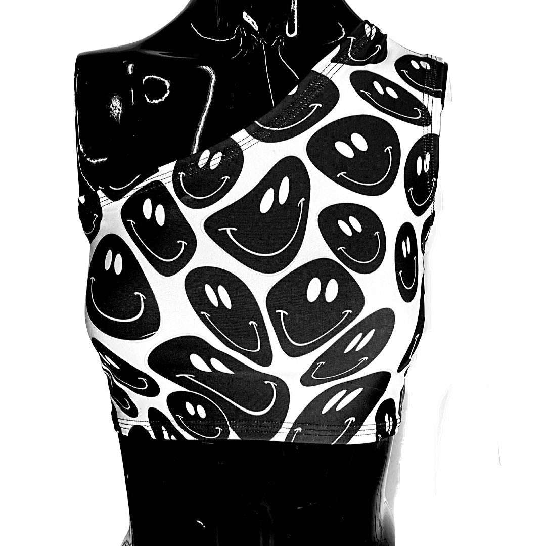 You'll be radiating good vibes in this smiley one shoulder crop-top. It's a must have for your festival and rave wear. Hand crafted by THE Lyte Couture this shirt is a part of the exclusive collection, so get them while they're in stock and pair them with the smiley mismatched high-waisted bottoms.